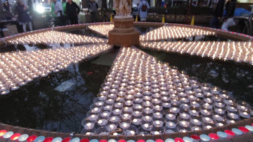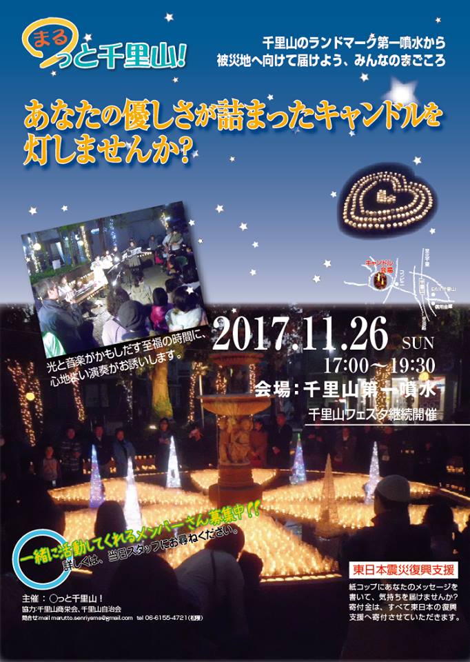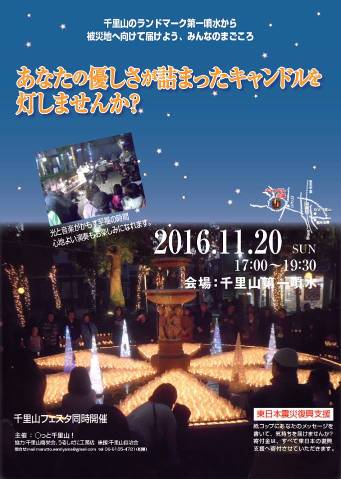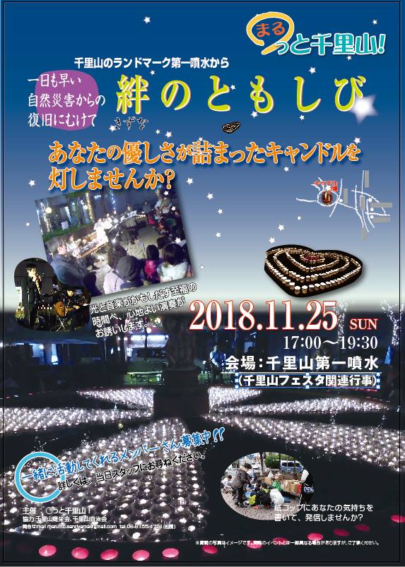 〇っと千里山 絆のともしびは、毎年11月の末に千里山第一噴水に約2000個のキャンドルを浮かべております。 当日に第一噴水のイルミネーションの点灯も同時に行っております。