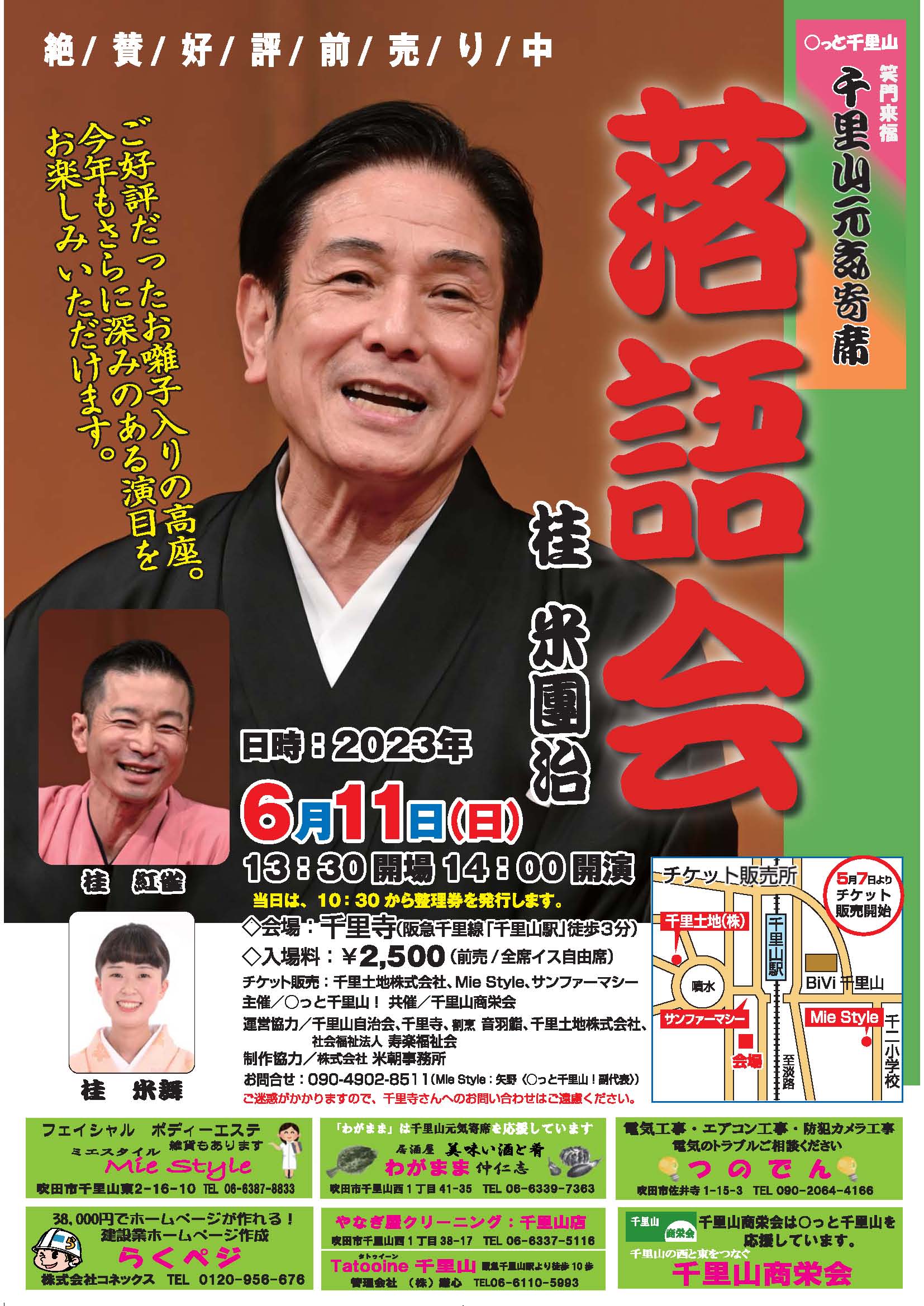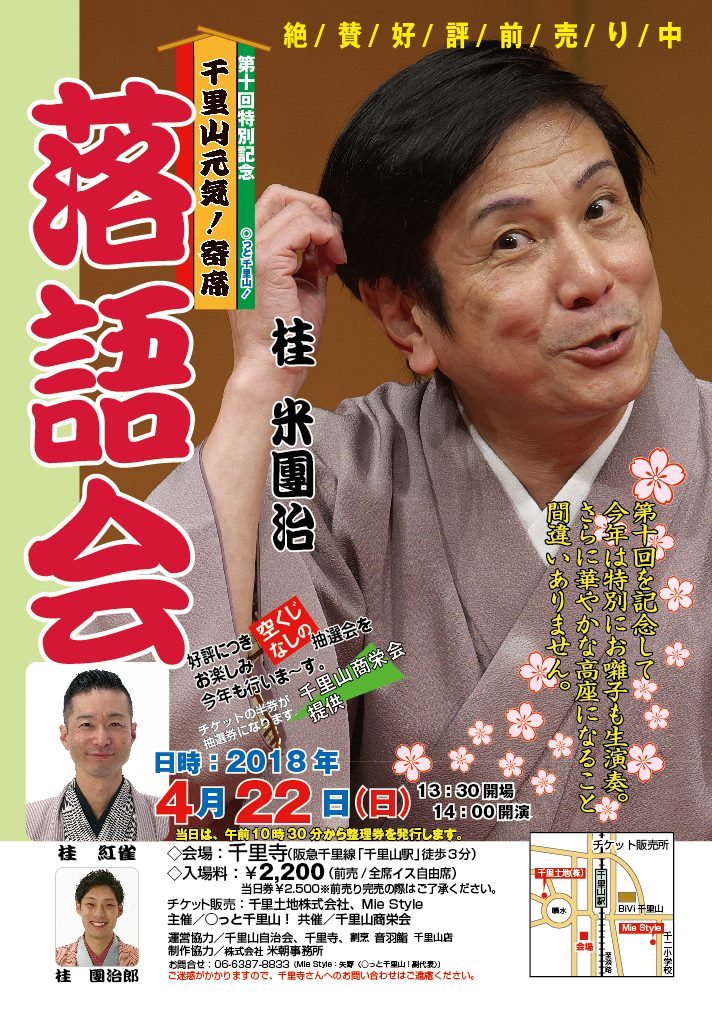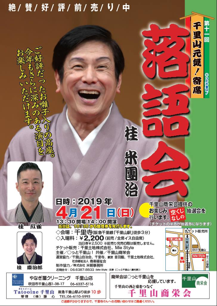 〇っと千里山 元気寄席 落語会では、毎年4月の末に千里寺の本堂にて行っております。 出演は毎年変わりますが、千里山にゆかりのある落語家さんにご出演頂き大変ご好評を頂いております! 千里山商栄会さん提供の「お楽しみ抽選会」も行っております。 落語を聞いて笑い、抽選会でにっこり。ステキな春の一日が楽しくお過ごしになれると思います。